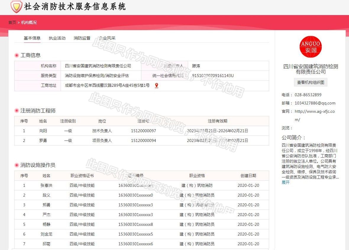 四川省安國建筑消防檢測有限責(zé)任公司,成立于1998年,經(jīng)四川省公安消防總隊(duì)批準(zhǔn),工商部門注冊的獨(dú)立法人單位。